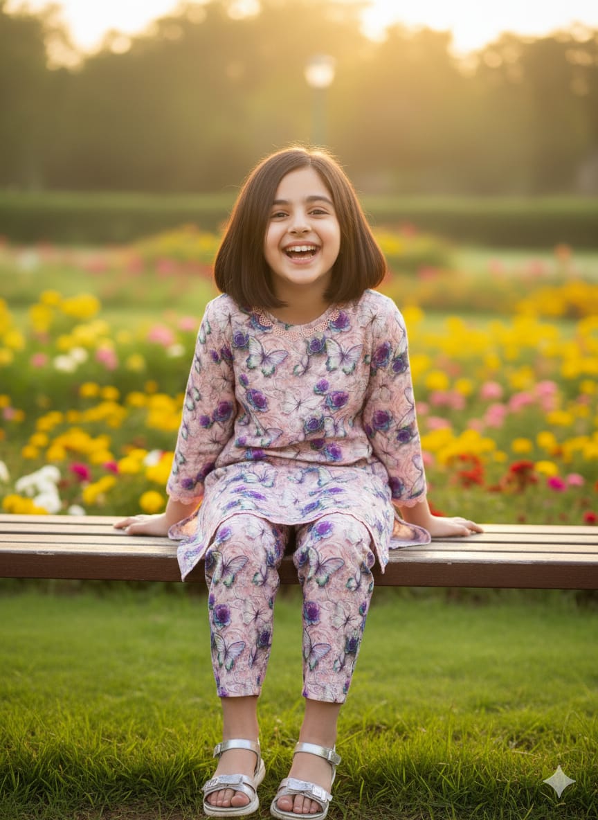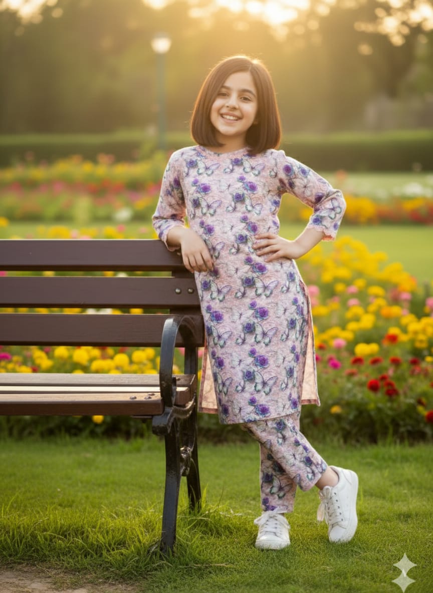 This enchanting outfit features a delightful butterfly print in soft shades of purple and pink on a high-quality, premium boski linen fabric. The comfortable, full-sleeved kurta and matching trousers are perfect for a bright, casual day out, offering both elegance and ease of wear in the lush setting.