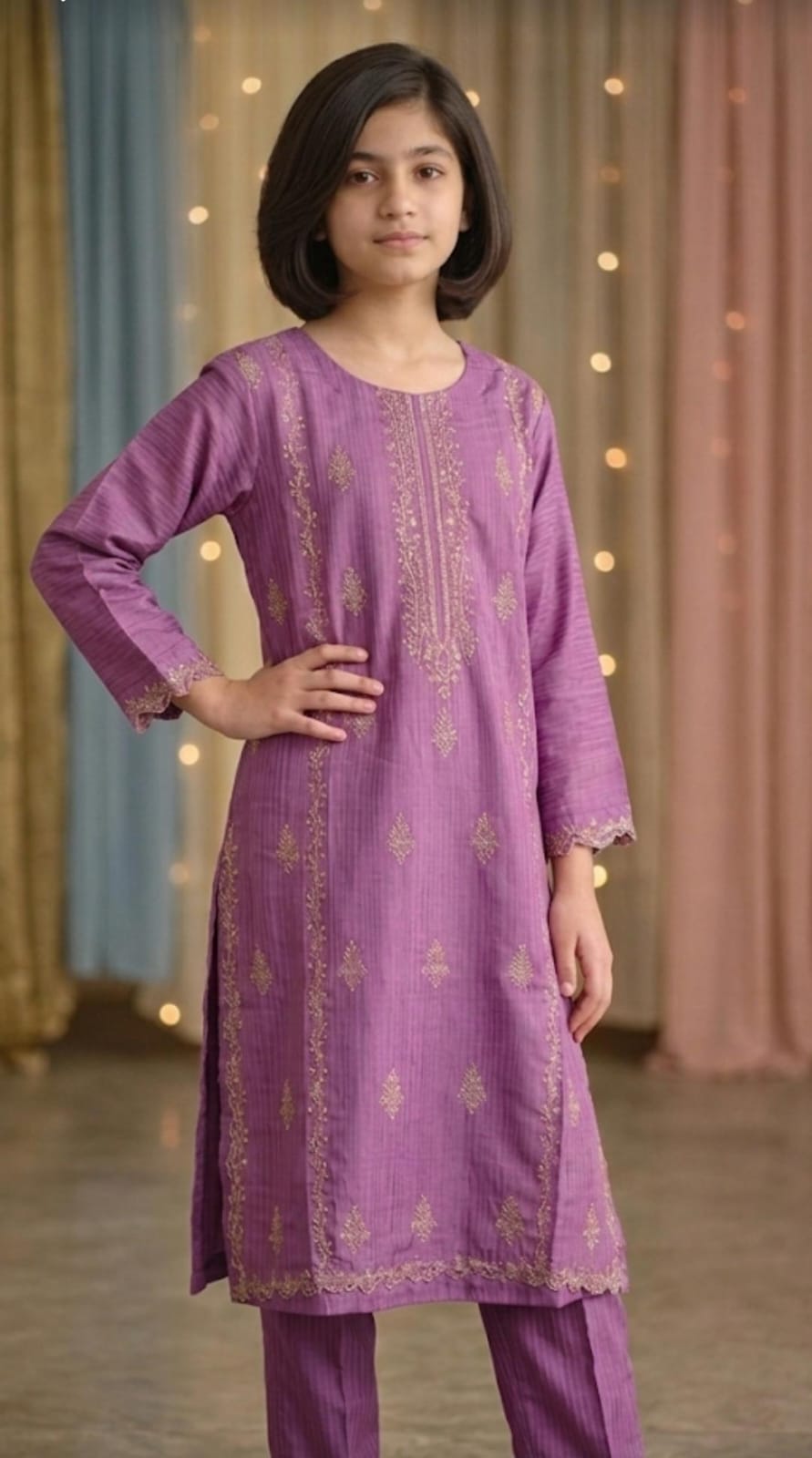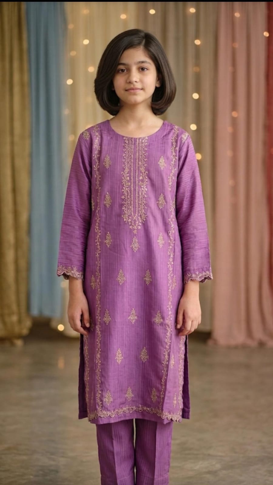 Make your girl look elegant with this beautiful lavender embroidered kurta trouser set for girls. This stylish outfit features full front embroidery with delicate cutwork on sleeves and daman, giving it a premium festive look.