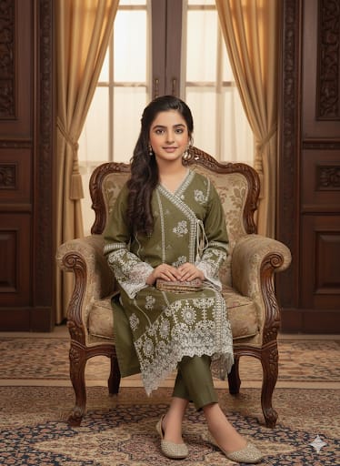 This elegant olive green two-piece cotton suit for girls is designed to bring comfort and style together. Made from premium quality breathable cotton, this outfit is perfect for everyday wear, casual gatherings, and festive occasions.
